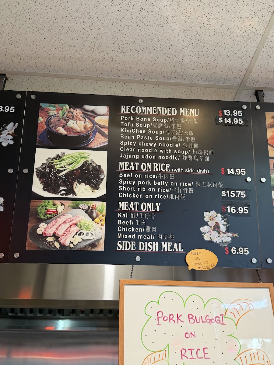 The menu is well-suited for quick lunch or takeout meals due to the inclusion of lunch boxes and combo sets, providing balanced portions with accompanying side dishes. Customers typically utilize the menu for grabbing convenient, ready-to-eat Korean meals throughout the day.